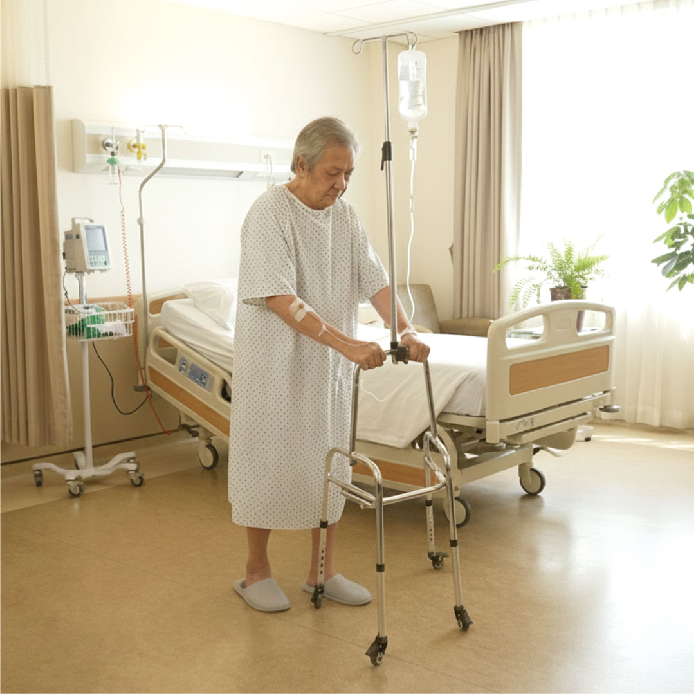 IV pole walker helps patients to walk when having injections. With IPW, patients can walk to the toilet independently. It’s very stable while using. IPW can even support patients to get up from bed or chair.